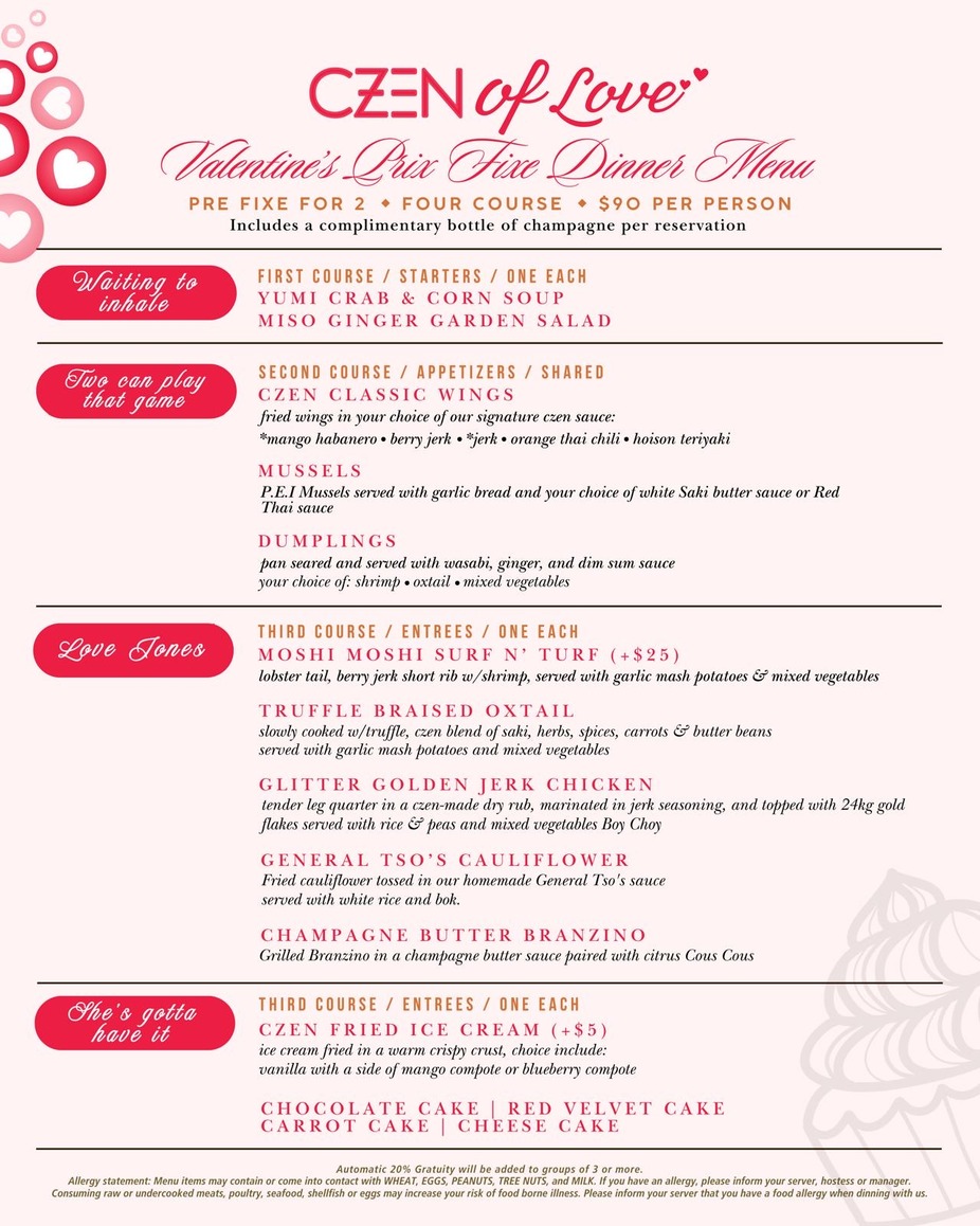 Savor Czen’s signature Caribbean-Asian fusion dishes, packed with bold, exciting flavors that will delight every bite. Toast your love with handcrafted cocktails or sparkling champagne as you enjoy the music and the moment—every detail designed to make your Valentine’s night truly special. Reserve your table today and create memories that will last a lifetime. Reserve your table here